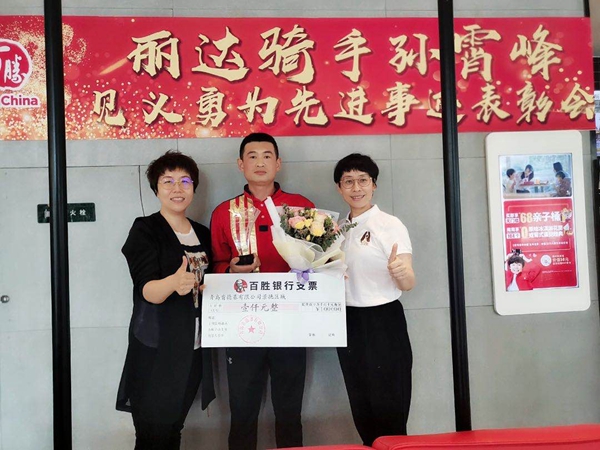 7月16日,孫霄峰再次接到盛女士求助電話(huà),他立即趕往老人家,因敲門(mén)無(wú)人應(yīng)答,孫霄峰與盛女士開(kāi)啟了視頻通話(huà),并在盛女士的指引下進(jìn)入家里。這時(shí),孫霄峰發(fā)現(xiàn)老人趴在衛(wèi)生間地上,便趕忙將老人抱到沙發(fā)上,用毛巾清理老人嘴角和臉上的嘔吐物及血跡,在盛女士的同意下聯(lián)系了120,并協(xié)助醫(yī)護(hù)人員將老人送到就近醫(yī)院。經(jīng)診斷,老人是腦出血,需及時(shí)手術(shù),但所在醫(yī)院無(wú)法治療,孫霄峰又主動(dòng)聯(lián)系轉(zhuǎn)院,辦理相關(guān)手續(xù),老人得到及時(shí)救治,轉(zhuǎn)危為安。得知孫霄峰并非老人的子女,主治醫(yī)生被他的熱心行為深深感動(dòng)。為了感謝這位“大愛(ài)騎手”,盛女士將寫(xiě)有“助人為樂(lè)正能量 鼎力救助暖人心”的錦旗送給了孫霄峰,她說(shuō):“感謝肯德基這個(gè)有溫度的品牌培養(yǎng)這么好的員工,是他讓我感受到人間大愛(ài)!