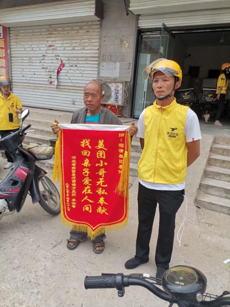 李仟按照朋友圈中發(fā)布的聯(lián)系方式與小女孩的父母聯(lián)系,電話(huà)終于在焦急的等待中接通了,孩子的父母在電話(huà)里聽(tīng)到孩子安全的消息,激動(dòng)的哽咽了,不住地感謝李仟。小姑娘也終于快樂(lè)的跳了起來(lái),李仟看著孩子終于放松下來(lái)的小小身影,自己也禁不住悄悄笑了。李仟和小姑娘的父母約定在臨清市三和購(gòu)物廣場(chǎng)路口碰面,李仟他們先到的,想到孩子這個(gè)時(shí)間可能餓了,他又給孩子購(gòu)買(mǎi)了面包和礦泉水,小姑娘看著這個(gè)叔叔感激的不知道該怎么說(shuō)。沒(méi)過(guò)多久孩子的父母就匆匆趕來(lái)了,孩子?jì)寢寷_過(guò)去抱住了孩子,她眼里的淚花在夜間的燈火中閃閃爍爍,孩子爸爸拉著李仟的手,不住的道謝。幾天后,小姑娘的家人將寫(xiě)有“美團(tuán)小哥無(wú)私奉獻(xiàn) 找回親子愛(ài)在人間”的錦旗送到美團(tuán)外賣(mài)臨清站,以表示對(duì)李仟的深深感謝。