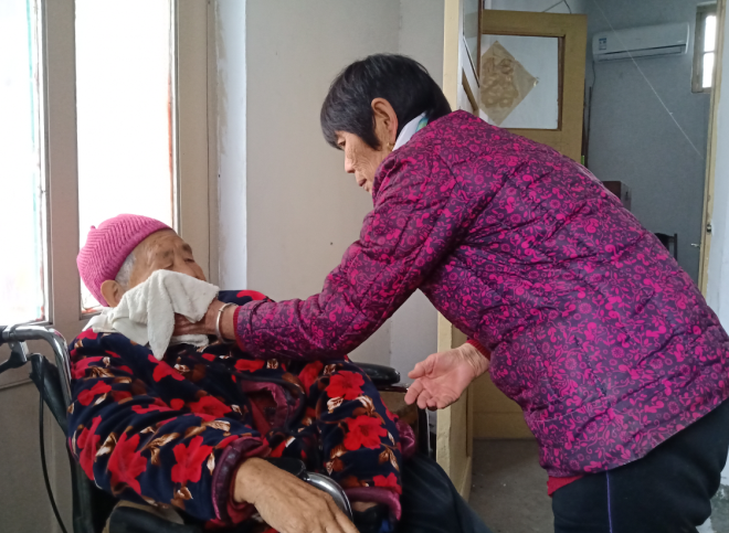 對于楊慶榮來說,她的一天是從早晨6點鐘開始的!澳昙o(jì)大了,睡的也不沉,就起來打掃打掃屋子,”她解釋道。順著她“閑不下來”的手望過去,只見里屋的兩張床床尾頂著床頭的緊挨在一起!拔业煤退∫婚g,方便她晚上起來的時候喊我”。婆婆白天喜歡睡覺,晚上像小孩一樣要醒好幾回,她怕離遠了聽不見,就把自己的床鋪布置到婆婆旁邊。早晨8點,婆婆醒了,穿衣服、扶上輪椅、洗臉、做飯、把飯端到面前——對于楊慶榮來說,這一套“流程”已經(jīng)駕輕就熟。每一天,她就像陀螺似的轉(zhuǎn)個不停!俺矛F(xiàn)在還能干得動,就多干點兒,讓婆婆過得舒服點兒!睏顟c榮說。婆婆體重有150多斤,98斤的楊慶榮扶起來很吃力,再加上80多歲老人的身體很脆弱,得小心翼翼、輕手輕腳,一個晚上三四次折騰,楊慶榮總是又困又累。盡管如此,她依然堅持夏天每天為婆婆擦身,冬天天冷,就勤換衣服,兩三天就換一身。家里沒有洗衣機,她就手洗,即使自己生病難受,這些在她看來“應(yīng)該做的”事情,也一件不落下。楊慶榮還記得,自己有一次感冒發(fā)燒,在診所打了八九天的吊瓶,身體十分虛弱,但“想到婆婆還沒吃上熱飯,心里就放心不下”,回到家,她又強撐著忙上忙下。還有一次,在家中打掃衛(wèi)生的楊慶榮不小心撞到了輪椅上,腿被刮了個大口子,血止不住地流,她去診所包扎完后馬上往家趕,忍痛把手中的活干完,“到現(xiàn)在疤還在”,楊慶榮挽起褲管指了指。婆婆喜歡吃肉,吃菜也光挑肉吃,楊慶榮就變著法兒地給婆婆調(diào)劑口味,有時是炒肉絲,有時是雞腿,“這不,明天打算給她燉個排骨”,楊慶榮打開冰箱,是兒子昨天剛送來的排骨,在她的言傳身教下,孩子們都十分孝順,這令她自豪不已。正是因為楊慶榮將婆婆照顧得如此無微不至,整個房間里沒有一絲異味,婆婆也沒有生過褥瘡,體重反而比生病之前又“漲”了不少。
