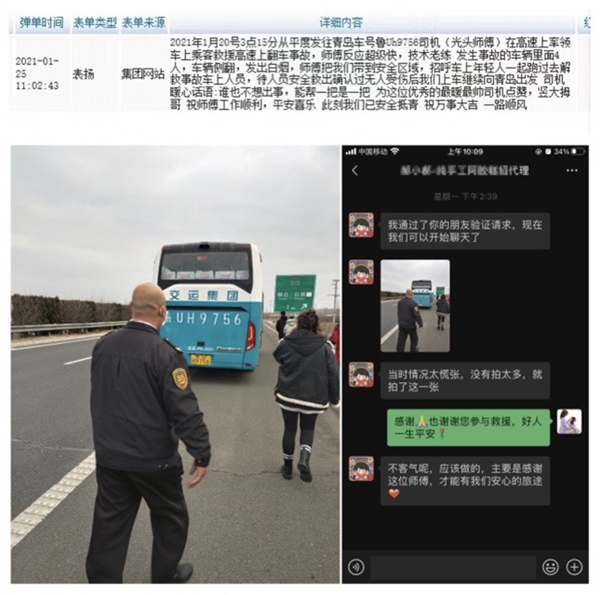 “2021年1月20日下午3時許從平度發(fā)往青島車號魯UH9756司機師傅在高速上率領(lǐng)車上乘客救援高速上翻車事故,師傅反應(yīng)超級快,技術(shù)老練,發(fā)生事故的車輛里面有4人,車輛側(cè)翻,發(fā)出白煙,師傅把我們帶到安全區(qū)域,招呼車上年輕人一起跑過去解救事故車上人員,待人員安全救出確認(rèn)過無人受傷后我們上車?yán)^續(xù)向青島出發(fā)。司機暖心話語:誰也不想出事,能幫一把是一把,為這位優(yōu)秀的最暖最帥司機點贊,豎大拇哥,祝師傅工作順利,平安喜樂,此刻我們已經(jīng)抵青,祝萬事大吉,一路順風(fēng)!”近日,青島城運控股交運集團平度發(fā)展事業(yè)部收到的這份表揚件揭開了一段客車駕駛員與乘客齊心救人見義勇為不留名的故事。