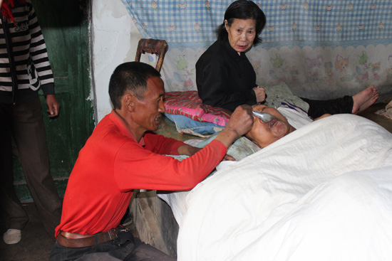人們常說:“久臥病床心意灰!庇钟腥苏f:“久病不愈性怪僻!边@些話往往會在大病久臥之人的身上體現(xiàn),脾氣變壞或性格古怪。但對癱瘓病人來說最怕的還是生褥瘡,牛國昌每隔三小時(shí)就為父親翻一次身,不厭其煩地為其翻身、擦身、刷牙、洗臉、喂飯、端屎尿、換被褥、按摩手腳、洗臟衣物,一絲不茍地照料著父母的生活。鄉(xiāng)親們都說:“方圓百里也找不著國昌這樣的好孩子啊”。為方便照顧父母,婚后他和妻了一直過著“分居”生活,堅(jiān)持睡在父母的房間。半夜父母尿床了,他趕緊起來給他換床墊;看父母難受,趕緊起來喂水喂藥。為了父母能夠睡個(gè)安穩(wěn)覺,他平均每晚要起床查看三四次。還要定時(shí)定點(diǎn)地服侍父母吃藥。父母要照顧,一家人的生活都靠他,農(nóng)活一樣都不能落下,就這樣,他每天凌晨4時(shí)就要起床打理,這么多年來,他睡囫圇覺的時(shí)候很少。沉重的生活壓力使得這個(gè)中年漢子臉上布滿了滄桑,可是他一直咬牙堅(jiān)持著。為了減輕生活負(fù)擔(dān),大女兒也放棄了學(xué)業(yè),這是牛國昌心里最大的痛,可是家里的經(jīng)濟(jì)條件實(shí)在支撐不起。