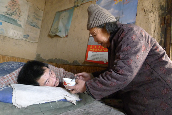 蘇建筑長(zhǎng)大了,身子已經(jīng)很重了,手推車(chē)已經(jīng)放不下了。張樂(lè)英和老伴將他放在炕頭上,精心為他換洗尿布、擦洗身子、理發(fā)、喂飯等。眼看著左鄰右舍種田多,收入年年增高,而自己因?yàn)檎疹檭鹤佣荒苓^(guò)多參與田間勞動(dòng),張樂(lè)英也著急過(guò),可是再看看可憐的兒子,她覺(jué)得從道義與感情上都不能放棄……