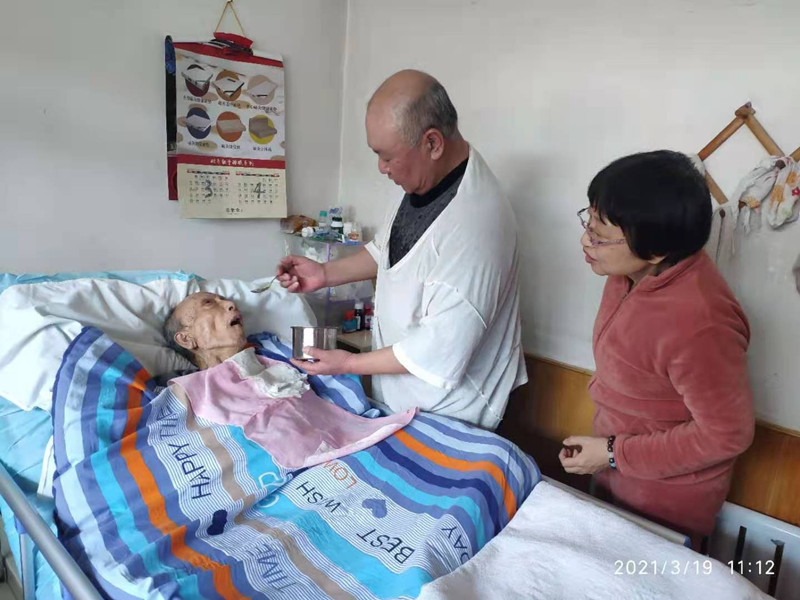 王兆奇是個(gè)達(dá)觀之人,從沒(méi)有因?yàn)樾枰疹櫜∪吮г估悟},問(wèn)及原因時(shí),他略有深沉地說(shuō),岳父是個(gè)苦命的人,少年喪父,中年喪妻,老年喪子,如今,我說(shuō)什么也不能再讓老人受苦了。王兆奇日常生活的大部分時(shí)間和精力都放在了照顧老人身上。為了保障老人的營(yíng)養(yǎng),他一日三餐不重樣地給老人做飯,飯做好后,再把飯打成飯糊,一口一口地喂給老人吃,雖然老人聽(tīng)不懂話,但他總是一邊喂飯,一邊和老人聊天。老人臥床不能活動(dòng),接屎端尿、翻身按摩,他從來(lái)沒(méi)有嫌棄過(guò)老人。為了更好的照顧老人,還主動(dòng)去學(xué)習(xí)護(hù)理知識(shí),堅(jiān)持每天為老人擦身體、按摩、扣背,日復(fù)一日,年復(fù)一年,熟練地動(dòng)作堪比專業(yè)護(hù)理人員。在他的精心護(hù)理下,老人臥床7年來(lái),從來(lái)沒(méi)有得過(guò)褥瘡。