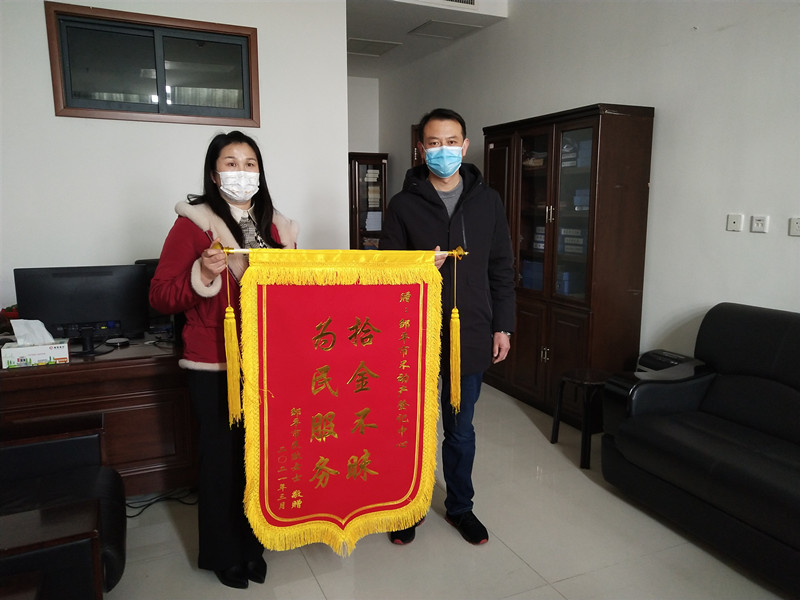 2021年3月9日,失主耿女士將印有“拾金不昧,為民服務(wù)”的錦旗送到段繼波手中。并連連道謝“真是太感謝你們了,沒(méi)想到這么快就找回了錢(qián)包!