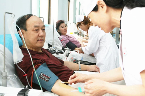 李尚杰在捐獻(xiàn)全血的同時,還捐獻(xiàn)特殊血——即血液中的血小板。全血包括成分血和血漿兩部分,而成分血是由紅血球、白血球和血小板組成。李尚杰每次都捐獻(xiàn)兩個治療量的血小板(相當(dāng)1600毫升全血)。他說,捐獻(xiàn)血小板的過程比獻(xiàn)全血復(fù)雜的多,捐獻(xiàn)全血在采血車上3—4分鐘即可完成,而捐獻(xiàn)血小板必須到省血液中心,在專門采血機(jī)上進(jìn)行。他比劃著說:“兩只胳膊全插上針管,血液從一只胳膊抽出來,經(jīng)過分離機(jī)把血小板采集后,再把其它血液從另一只胳膊輸回去。我每次獻(xiàn)兩個治療量血小板時,幾乎把全身的2/3的血液抽出來,在體外循環(huán)分離,要用2—3個小時的時間,這其間一動也不能動彈......”