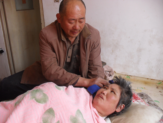 由于天天給妻子按摩,一日三餐都要搬動喂飯,溫培松的胳膊已經(jīng)累彎了,怎么也伸不直了;麻木的雙手經(jīng)常握不到一起;腰部也嚴重受損,有時痛得都直不起來……但溫培松從來不舍得去醫(yī)院看看,痛了就在藥店買點止痛藥。由于要照料鞠永芳,溫培松沒法外出打工掙錢,只能靠種地掙點錢,再加上鞠永芳一直需要用藥物調(diào)理,家里已經(jīng)一貧如洗。然而最讓溫培松欣慰的是,鞠永芳已經(jīng)從原來什么反應(yīng)也沒有,恢復到聽到聲音能轉(zhuǎn)頭,偶爾還能聽明白一兩句話,嘴唇還會動一動了。