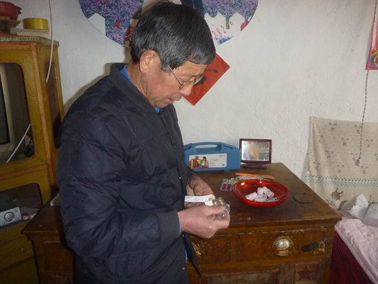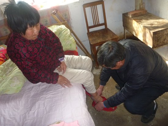 為了照顧妻子,劉萬華放棄了外出打工的機(jī)會,僅僅靠家里僅有的二畝多地來維持生計。每天給妻子吃飯、打針、喂藥、清洗臟衣服、幫妻子晾曬被褥,這一晃就是二十多年。由于王;ǜ觳矡o力支撐自己的身體,連翻身都需要劉萬華的幫助,王福花一晚上要翻身20多次,劉萬華總是耐心細(xì)致的幫助妻子,從沒有厭煩。為了軟化血管伸展四肢,王;ㄐ枰ㄆ诖螯c(diǎn)滴來軟化血管,因為害怕醫(yī)療事故的發(fā)生,醫(yī)生不愿意出診治療,劉萬華便一遍一遍的打電話,甚至登門請醫(yī)生到家中為妻子打點(diǎn)滴。由于長時間無法直立行走,妻子王;ǖ碾p腿已經(jīng)開始萎縮,劉萬華便每天定時幫妻子按摩。如今,60多歲的劉萬華總是要帶上老花鏡才能幫妻子拿藥,因為他害怕給妻子拿錯藥;每次喝藥前他也總是先嘗嘗水溫,怕燙到妻子……劉萬華無微不至的關(guān)懷讓妻子的心情漸漸好起來。