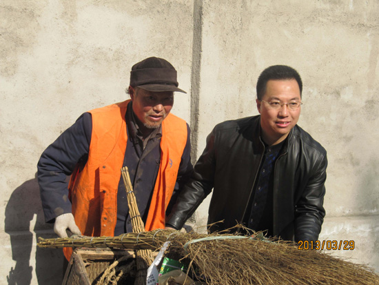 有一個60歲左右負責(zé)小區(qū)東側(cè)衛(wèi)生的大叔,身體還算硬朗,他總想多承包幾塊地方,多干點,以便能多掙點錢。在他負責(zé)的區(qū)域的邊上,有一個高出地面一米半的平臺,多年來上面一直堆滿了石塊、樹枝、碎玻璃等廢棄物,嚴重影響環(huán)境。2012年秋天,張月濤跟他商議,借用他的小推車和大掃帚,與他一起,用了一個多小時的時間,徹底將此清理干凈。自此,他也算認識了這位身體健壯、勤快能干的大叔。現(xiàn)在,每天早晚遇見他,彼此總是熱情招呼一下。