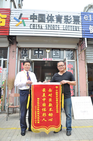 2013年5月14日上午,彩友林先生來到煙臺(tái)體彩芝罘區(qū)金溝寨小區(qū)05672站點(diǎn),將一面寫著“面對(duì)巨款不動(dòng)心,最美中國(guó)體彩人”的錦旗鄭重地送到了該體彩站站長(zhǎng)任春銘手里。原來,幾天前林先生到任站長(zhǎng)的店里買體育彩票,不慎將一個(gè)裝有10萬元現(xiàn)金的包裹遺忘在那里,任站長(zhǎng)誠(chéng)信守護(hù)巨款19個(gè)小時(shí),終將10萬元現(xiàn)金“完璧歸趙”。