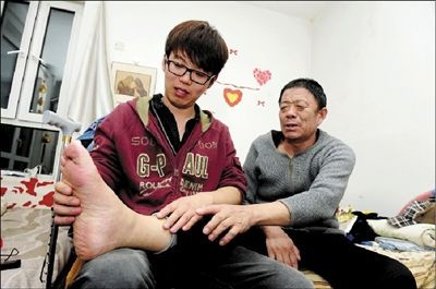 每天,曉杰的父親都興洋要做4次康復(fù),在醫(yī)院,一個關(guān)節(jié)的按摩價格是80元,而一天下來,僅是按摩的費用就得1000元,為了省錢,曉杰向醫(yī)生學(xué)會了按摩的手法,將每天4次的按摩改為由醫(yī)生推兩次,剩下的兩次由自己給父親推。即使如此,只有支出沒有收入的父子二人,在北京的生活也逐漸捉襟見肘。