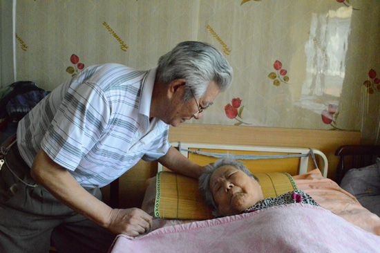 每天早晨6點,他準時起床,背上他的綠軍包到菜市場買菜,一周去藥店兩次給老伴買藥……回家后做早飯,自己顧不上吃,遲學典先把老伴的枕頭墊高,用湯勺撬開老伴的嘴一口口地喂。別人是一日三餐,曲俊敏是四餐,晚上9點鐘還要喂一次。每天給老伴抬胳膊“活血”兩次,每次抬50下。每2小時幫老伴翻一次身,并拍打、按摩全身20幾下,這是遲學典每日的必修課,“不然她身上容易長褥瘡。”就連每天晚上,他都要起來2-3次幫老伴翻身。