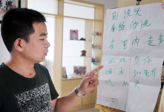 就這樣,生活所有的壓力都落到了徐憲慧一個人的肩膀上。她依靠著一個妻子對丈夫的責(zé)任感、對孩子的愛堅強(qiáng)起來,挺起腰桿挑起了照顧一家人生活的重?fù)?dān)。剛出院回來的時候,丈夫只能臥床,徐憲慧每天給他喂飯、洗刷、按摩,幫助他上衛(wèi)生間,晚上幾乎沒有睡過一個好覺。在這一年多的時間里,丈夫因?yàn)椴∏榘l(fā)作又進(jìn)了7次醫(yī)院,每次她都寸步不離?嗬鄣臅r候,她總會想起以前丈夫?qū)λ捏w貼,心里就又有了莫大的鼓舞和動力。如今,她最開心的就是經(jīng)過自己悉心照料,丈夫已經(jīng)有了一定的自理能力。