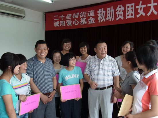 把為慈善事業(yè)捐款、消除社會(huì)貧困一直是王廣成的價(jià)值觀。近年來,在帶動(dòng)濟(jì)寧匯源建安有限公司在持續(xù)快速健康發(fā)展的同時(shí),他認(rèn)真履行企業(yè)公民責(zé)任,大力支持慈善公益事業(yè),積極參與扶貧助困,捐資助學(xué)等社會(huì)公益活動(dòng)。2011年初,偶然聽到一個(gè)貧困女大學(xué)生的故事,讓王廣成很受感動(dòng)。二十里鋪前寺村的一個(gè)貧困女大學(xué)生,父親去世后母親改嫁,跟著年邁的爺爺奶奶生活,考上了大學(xué)卻沒錢上。王廣成回老家時(shí),聽說孩子打算放棄學(xué)業(yè)出去打工,他二話不說,找到孩子,資助了這個(gè)孩子的學(xué)費(fèi),一直資助到大學(xué)畢業(yè)。這件事情之后,王廣成和幾個(gè)愛心人士聯(lián)系了區(qū)婦聯(lián)、區(qū)民政局,于2011年6月1日成立了誠陽愛心基金會(huì),救助范圍主要集中在二十里鋪街道所轄的村居,包括貧困大學(xué)生,貧困孩子和貧困母親。了解到哪個(gè)村民需要幫助,基金會(huì)的工作人員去家里核實(shí)后,就會(huì)獻(xiàn)愛心,幫助需要幫助的人。