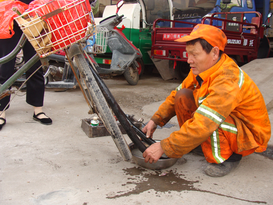 環(huán)衛(wèi)車隊現有各類用途、各種型號車輛10余部,車型多、結構復雜、維修量大。由于垃圾清運車輛每天都在凌晨四五點鐘工作,而且垃圾場中鐵釘之類的東西經常扎破輪胎,為確保及時清運,不論早晚,車壞在哪里,他就帶著工具跑到哪里維修,無論寒冬還是酷暑,他都始終如一,一直堅持。據保守估計,每天以補一個輪胎計算,在他從事維修工作13年來,就一共修補了4300多個輪胎,笨重的輪胎卸上卸下,全是他一人完成,工作量之大,是常人難以承受的,長期的勞累造成他腰椎間盤突出,患上了嚴重的腰腿疼,可他卻沒有任何怨言。