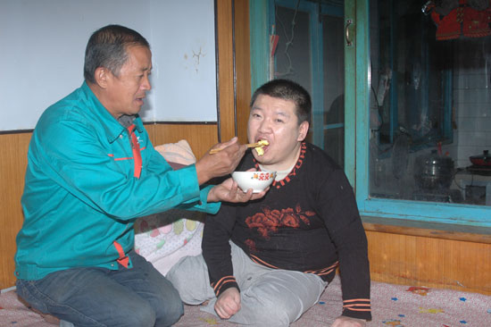 隨著兒子病情的穩(wěn)定,張鼎成夫妻倆漸漸習(xí)慣了這種生活,每天夫妻倆不厭其煩地給兒子一口一口地喂飯,然后給他擦洗身子,把換下的尿布清理干凈。夏天,為避免兒子長(zhǎng)痱子,這樣的工作每天要重復(fù)更多次數(shù),走進(jìn)這個(gè)平凡普通的農(nóng)村院子,繩子上常年晾曬著兒子的尿布。當(dāng)別人都享受著兒女承歡膝下,父母頤養(yǎng)天年的歡樂(lè)時(shí),張鼎成卻在照料著體重比自己還要重的兒子。在夫妻倆眼里盡管兒子智力上與正常人有差別,生活上不能自理,但是每天看到孩子,總覺(jué)得生活還有希望。“只要我們不放棄,兒子一定會(huì)好,現(xiàn)在就是拼盡全力也要照顧好他”,夫妻倆深夜經(jīng)常這樣相互鼓勵(lì)。日子雖然艱難,但兩個(gè)人相濡以沫、同舟共濟(jì),一切都在有條不紊的進(jìn)行,日子也在平靜中慢慢度過(guò),一年、一年……。