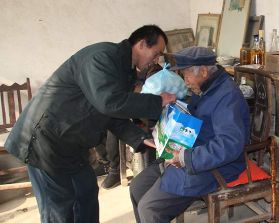 高占喜是一名普普通通的郵遞員,雖然送報送信是本職工作,但他心中對兩位老人十分放心不下,就慢慢地,經(jīng)常去老人家里轉轉,看看他們,掃掃院子、提提水。剛開始,汝大爺不太信任他,高占喜走到哪里,他就跟到哪里。再后來,高占喜就從家里給他們帶去饅頭、包子、面條、玉米面,還給他們買雞蛋,青菜,牛奶、棉襖、棉褲、棉被,老人看到高占喜對他們好,就對他逐漸地產(chǎn)生了信任。特別是后來有一次,汝大娘不小心從床上摔下來,高占喜正好從村頭看見汝大爺正在喊人,就一溜小跑到老人家,然后用地排車把大娘送到了隔壁村最近的診所。前前后后兩個星期,高占喜每天都到診所看望大娘,把她當作自己的親人一樣,每天都給她洗臉洗腳,以及倒便盆。老人十分感激,到現(xiàn)在掛在他們嘴邊上的一句話就是:“多虧了喜,沒有喜,我們兩個早就活不下去了。感謝共產(chǎn)黨,感謝政府!”當時,因為做這件事是自發(fā)自愿的,所以高占喜沒有告訴任何人,包括妻子。由于自己的工資當時也不是很多,一個月也就只有三四百塊錢,三分之一留給家用,三分之一做平時的開支,三分之一給老人,時間一長,家里經(jīng)常少東西,工資也不能全拿回去,一年多后,最終不得已才告訴了妻子。