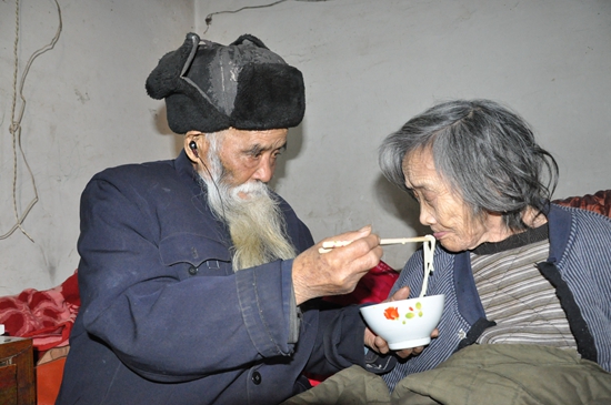 趙相于夫妻倆都已88歲高齡。普通的小院,兩棵白楊,兩間小屋,在偏西的小屋內(nèi),滿頭華發(fā)、面色蒼白的妻子緊閉雙眼,脖子上圍著一塊毛巾,躺在床上“嗚嗚哇哇”地說著只有趙相于才聽得懂的話。近旁,頭戴氈帽、胡子花白的丈夫,用顫抖的手端著一個(gè)碗,一勺一勺地在給的妻子喂水、喂飯。眼前這份簡(jiǎn)單的幸福,不禁令人動(dòng)容。