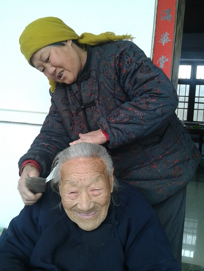 黃慶愛是顏莊鎮(zhèn)野虎溝村一位103歲老人,老人年輕時老伴就已去世,唯一的女兒也因病早早過世。三口之家,早就只剩她一個人。史能菊,原本是老人的侄媳婦,因為史能菊的丈夫吳會茂過繼給了黃慶愛。這稱呼也由“大娘”變成了“娘”。1971年,21歲的史能菊嫁給了野虎溝的吳會茂。從嫁進(jìn)家門的第一天起,史能菊不僅要照顧自己的公公、婆婆,還要照顧“大娘”黃慶愛。剛進(jìn)門不長時間,老人就得了肝硬化,肚子鼓得像個皮球。吳會茂和史能菊帶著黃慶愛四處求醫(yī),得到的答案幾乎一致——— “放棄治療”。史能菊死活不甘心,“俺不認(rèn)字,就認(rèn)死理,難道就推回家等死?”她四處托人找偏方,沒想到黃慶愛在吃了她找的偏方后,竟然奇跡般地活了過來。
