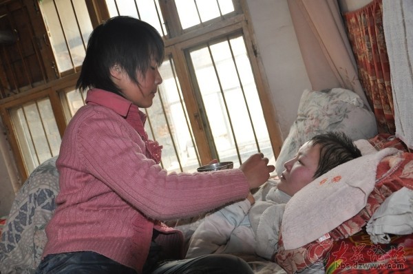 孫悅的皮膚比同齡孩子略顯黝黑和粗糙,坐在人群中間,可能沒有人會(huì)特別地注意她。但就是這樣一位不起眼的12歲女孩,卻做出了令人感動(dòng)不已的事跡。孫悅每天都早早起床,趕在學(xué)校上課之前,扶媽媽坐臥起來,然后用打濕的毛巾幫媽媽擦臉擦身。再將煮的軟糯的粥一勺一勺喂給媽媽吃。而自己的早飯多數(shù)是就著粥湯吃下一個(gè)煎餅了事。中午放學(xué)回家趕緊忙著給媽媽做飯嚼飯喂飯,按摩身體,喂藥倒尿,將換洗的衣服浸泡,晚上放學(xué)后回家再洗出來。孫悅說,喂飯時(shí)不能離嗓子近,那樣會(huì)嗆著媽媽。也不能離唇邊近,那樣這口飯會(huì)掉落一些,媽媽就吃不到了。