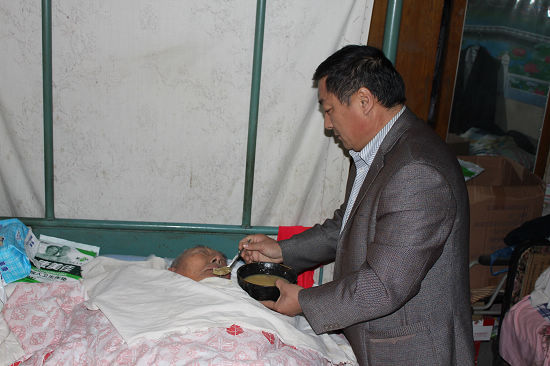 伴隨著年齡的衰老和病情的加劇,父親的身體素質(zhì)明顯下降。雖然骨壞死病經(jīng)過四年的治療已基本痊愈,但腦血栓病卻一天天加重,剛開始他走路不得不用雙拐,后來走不動就坐輪椅,再后來就躺倒了床上,如今已躺床5個年頭,并且大小便不能自理,起床、吃飯都需要伺候。母親多病,今年82歲,身體條件差,晚上照顧體重170斤的父親,非常困難,父親晚間大小便更需要照顧,他就搬到父親房間和他一起住,為他喂水喂藥、換尿布。由于父親生活不能自理,他的吃喝拉撒都需要有人照顧。每到吃飯,一勺一勺喂飯成了家常事,可以說是常年累月,習以為常了。因為躺床,父親的大小便全由人伺候,白天還好辦點,每到晚上不僅要換尿布,還要換屎布。除此之外,他還堅持經(jīng)常給老人洗澡、擦身子、按摩。因此父親身上從未生過褥瘡。在老人的屋里,聞不到絲毫異味。伺候病重的父親已20余年了,可屋漏偏逢連陰雨,沒想到患有大腦智障的哥哥去年因為血壓偏高,也患上了腦血栓,躺倒了床上,生活不能自理,又一重擔壓在了張清鋒的肩上,但他從沒嫌棄過、、、、、、。面對這種情況,他想,每個人都可能有生病的時候,都有衰老的時候,到那時,自己的子女和兄弟如果不管不問,自己的心情又該如何呢。為了伺候好父親、哥哥,他盡量把時間安排緊湊,在不影響工作的同時,擠出時間回家給他們喂藥換尿屎布,保證他們身體干凈衛(wèi)生。