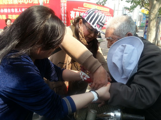 2014年5月12日上午九點(diǎn),西大街和海港路交叉路口出現(xiàn)“奇怪”的一幕:綠燈放行了,一位白頭發(fā)老者,推著一輛三輪摩托車站在路口一動(dòng)不動(dòng)。一分鐘,兩分鐘,堵在老人身后的公交車司機(jī)有些按捺不住,“嘀、嘀”地按著喇叭。這大叔怎么不挪步呀?突然老人身體朝車頭位置仰去,老人倒在地上,左手小指和無名指兩根手已經(jīng)在摔倒時(shí)生生被折斷,僅一點(diǎn)點(diǎn)皮肉連著,血不停地往身下滴?禳c(diǎn)!快點(diǎn)!”幾乎同時(shí),兩位站在人行道上的女士,飛奔到受傷摔倒的老人身邊。“快拿紙來!誰包里有紙!”一位年齡大概30多歲,頭戴斑馬紋鴨舌帽的女士上前一手掐住老人手腕,一邊仰頭問圍上來的路人!拔疫@兒有!”一位扎著馬尾辮的姑娘趕緊翻包抽出紙巾遞來。“快!打120!”“我打!”“馬尾姑娘”馬上撥打急救電話。此時(shí),老人好像摔懵了,瘦小的身體不停地顫抖著,眾人將老人扶起。 “家是哪的?打電話聯(lián)系家人!”“馬尾姑娘”詢問老人子女的電話,不停打電話聯(lián)系老人的親屬。“你以后千萬別再騎這個(gè)車了,太危險(xiǎn)了!”“鴨舌帽”按著老人滲出鮮血的手,心疼地說?粗先耸种铬r血直流“馬尾姑娘”傷心的哭了。 “來了來了!救護(hù)車來了!”,醫(yī)護(hù)人員到達(dá)現(xiàn)場馬上給老人包扎了傷口!榜R尾姑娘”隨著救護(hù)車一同去了醫(yī)院,圍觀的市民紛紛贊嘆道,“煙臺(tái)姑娘好樣的!”“應(yīng)該的,誰遇到了都會(huì)伸把手的。”“鴨舌帽”說。整個(gè)救人過程“馬尾姑娘”和“鴨舌帽”一直配合默契,記者也以為她們倆人是好朋友!澳隳莻(gè)朋友是哪兒的?”記者向這位“鴨舌帽”打聽道!拔也徽J(rèn)識她!我們都是路過的!