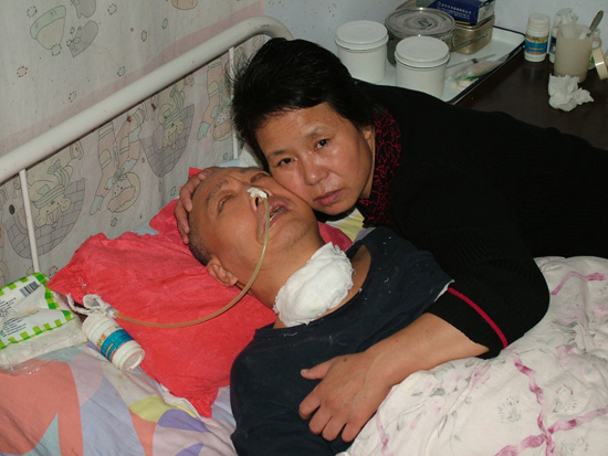 尹京榮的丈夫陳新華原是寒亭區(qū)工商分局工人,2005年,大腦腦干出血,被診斷為腦死亡,成了植物人。為了給丈夫治病,尹京榮多方打聽、四處求醫(yī),帶著不會(huì)動(dòng)的丈夫三次搬家。濟(jì)南、北京的大醫(yī)院她去過,小村子里的赤腳醫(yī)生她也找過。聽說南營村有個(gè)赤腳醫(yī)生針灸治病好,她就到南營租了兩間老房子陪丈夫看病。針灸治療了三個(gè)月,丈夫的病還是沒有起色。2006年初,尹京榮托人雇了一輛面包車,將丈夫拉到了北京天壇醫(yī)院。北京的醫(yī)院一號(hào)難求,為了能夠掛上號(hào),她半夜12點(diǎn)就來到醫(yī)院門診部樓前站隊(duì)排號(hào)。一夜的等候,換來了專家的接診。然而,僅有的一點(diǎn)希望也被打破了,老專家再一次給她的丈夫下了腦死亡的診斷。尹京榮失望地跟兒子講:“不跑東走西了,回家我們好好的照顧你爸爸,能看到這個(gè)人就總比沒有了強(qiáng)!