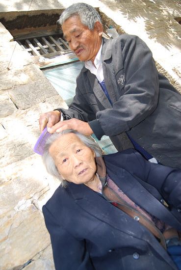 太陽晴好時、崔天苓就帶岳母在院子曬曬太陽,為老人梳梳頭