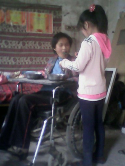 苗苗的母親癱瘓,生活無法自理,父親于五年前因心臟病發(fā)去世,家里還有73歲的奶奶和104歲的老奶奶。生活的重?fù)?dān)全部落在了這個(gè)7歲女孩的身上。從此柴米油鹽,洗衣做飯,她用羸弱的身軀,維系著這個(gè)支離破碎的家。五年如一日,苗苗晚上經(jīng)常和衣而睡,一聽到媽媽有動(dòng)靜就馬上起床照顧媽媽。每天天剛亮,苗苗就起來照顧媽媽起床洗漱。起床對于一般人來說是再平常不過的事,但對于苗苗的媽媽來說,卻異常艱難,全靠苗苗的幫助才能完成。由于苗苗力氣小,必須得趴在床上才能一步步把媽媽挪到輪椅上。一天又一天,一年又一年,李苗苗就是這樣照顧著癱瘓的媽媽。