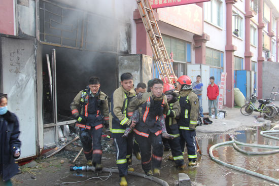到達(dá)現(xiàn)場(chǎng)的官兵迅速查明情況。起火的商鋪分為三層,一層是商鋪,二層三層用于居住。時(shí)間就是生命,馬志鵬決定,將救援人員分為三組,一組利用消防水槍從南側(cè)對(duì)火勢(shì)進(jìn)行控制,防止火勢(shì)繼續(xù)蔓延;一組利用消防拉梯進(jìn)入建筑內(nèi)進(jìn)行搜救,確定被困人員位置,進(jìn)行救援;一組負(fù)責(zé)滅火供水。馬志鵬親自帶領(lǐng)搜救組攜帶救援器材進(jìn)入現(xiàn)場(chǎng),由于現(xiàn)場(chǎng)濃煙籠罩,能見度太低,搜救人員只能進(jìn)行逐房搜索,終于在三樓一間房間內(nèi)找到了這兩人。為了節(jié)省救援時(shí)間,救援人員在孩子身上系上安全繩索,由消防戰(zhàn)士將孩子通過拉梯從三樓窗口抱至地面。同時(shí),馬志鵬摘下呼吸面罩,戴在被困婦女臉上,背起被困婦女,冒著濃煙經(jīng)由建筑內(nèi)部樓梯快速撤離現(xiàn)場(chǎng),挽救了兩條生命。