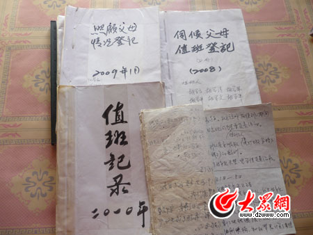 從2005年起,他們開始記錄《孝敬父母值班筆記》,《值班筆記》上詳細(xì)羅列了值班人、時間、本月給父母購置的東西、錢數(shù)、值班期間父母飲食生活怎樣、身體精神怎樣、值班人做了哪些工作(指生活調(diào)劑、衛(wèi)生等)、向值班人提出要求等條目,每一條都記錄的非常認(rèn)真詳細(xì)!吨蛋喙P記》卷首寫著“兄妹之間要團(tuán)結(jié)和睦,不斤斤計(jì)較,能相互諒解,相互支持,贍養(yǎng)好伺候好老人、以實(shí)際行動來報答父母的養(yǎng)育之恩”。胡成樂的七個兒女,年齡最大的已年過70,最小的也40多歲了。但九年來,不管因?yàn)槭裁丛,他們從未“空過崗”,誰有事忙不開了,其他兄弟姐妹都會爭著來代班。2007年,胡家兄妹又進(jìn)一步完善了伺候父母的措施,將其整理成《伺候父母過好晚年生活》的照顧指南,人手一份,里面著重指出每人都要帶著笑臉值班。說起“帶著笑臉”,大哥胡學(xué)云說:“父母為我們辛苦操勞了一輩子,把我們培養(yǎng)成社會需要的有用之才,功不可沒,現(xiàn)在他們老了,我們更應(yīng)該尊敬他們,不管發(fā)生什么事,回到家都要笑臉相迎,絕不給父母甩臉子,這一點(diǎn)我們都互相監(jiān)督”。