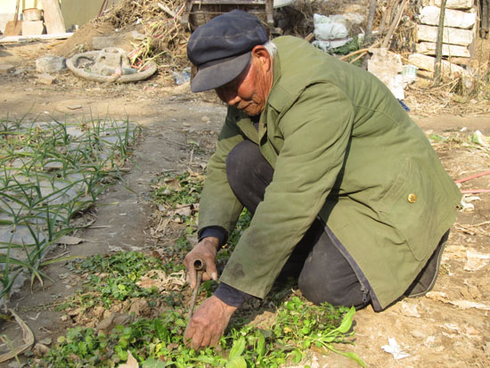 邢文漢在自己的二分地上,種了點白菜和大蒜。為了不麻煩親戚,他硬是忍著疼,跪在地上一點點用角鋤刨坑種菜,跪著給菜蓋上塑料薄膜。“兩行地得一天弄完,我自己能干的事就不麻煩別人!毙衔臐h說。就是這樣一位貧困的獨居老人,卻做出了一件不平凡的事兒。
