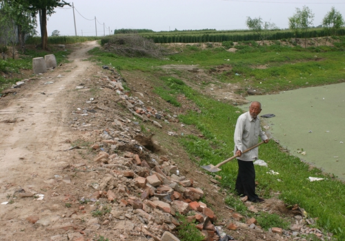 在普通村民眼里,許春生老人非常特殊,一天兩晌堅持放羊,手頭上總拿著一把鐵鍬。村里人介紹,在村西原來有一個2米多深的大坑,到村西的農(nóng)田干活必須從坑里通過。下雨后,常常會幾天、十幾天、甚至幾十天無法到村西農(nóng)田干活。如今連接三合莊村西農(nóng)戶居住區(qū)及千傾責任田之間的那條高2尺半、寬3米多的平整路面就是許春生老人一鍬一鍬鋪出來的。為了修通那段80多米的生產(chǎn)路,老人家設計、施工一肩挑,乞丐一樣四處收集生活垃圾,多方打聽哪里在施工、誰家要拆房,不知引來多少異樣眼神,不少村民笑言要看這個現(xiàn)實版的“精衛(wèi)”最終能填出一個啥模樣的“路”來。