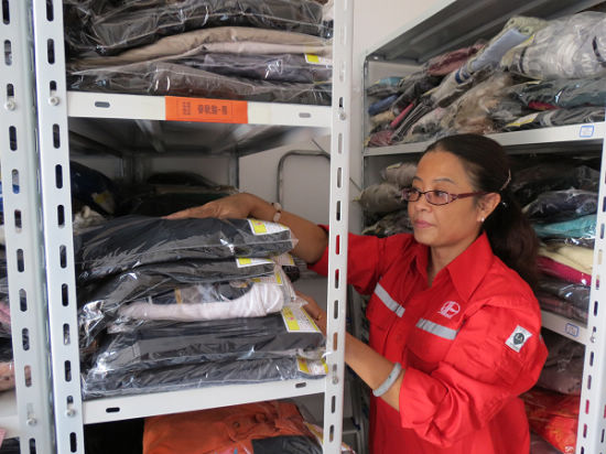 張俊在整理陽光義工服務社里愛心人士捐贈的衣物。
