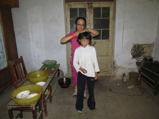 張俊在為這個有輕微自閉癥的孩子梳一個漂亮的辮子。
