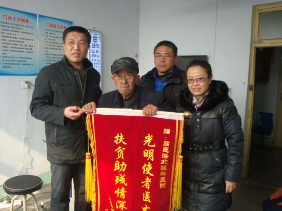 眼睛復明的何志玉老人送來錦旗。右一為張俊。