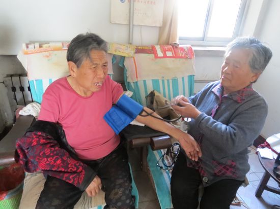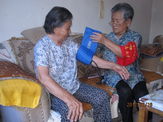 今年已76歲的萬學芬是閑不住的人,"出去串門我都隨身帶著聽診器、血壓計。干了一輩子醫(yī)生,雖然退休了,只要身體允許,就再多為附近的鄰居服務服務,我覺得這是我應該做的"。在85歲老鄰居胡學榮家,給老兩口量血壓后。又指導兩位老人如何用藥。78歲的老人張俊榮由于腦血栓于兩年前癱瘓在床,老伴身體也不是很好。于是,定期去跟兩位老人嘮嘮家常,定期為兩位老人檢查身體。
