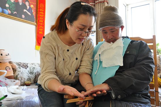 刷過(guò)牙后,張茂林在張慧的攙扶下,慢慢站了起來(lái),拄著扶手挪動(dòng)幾下腳步,燦爛的笑容灑在臉上。父親雖然漸漸醒過(guò)來(lái)了,但是智力卻跌落在了四五歲的水平,由于腦部受傷,手腳無(wú)力。學(xué)過(guò)醫(yī)學(xué)的張慧堅(jiān)信,只要認(rèn)真護(hù)理,父親會(huì)慢慢好起來(lái)。父親住院的時(shí)候,醫(yī)生使用針灸治療,張慧在一旁一邊幫忙一邊學(xué)習(xí)。父親出院后,張慧自己給他針灸,一堅(jiān)持就是7年。她先在自己身上試針,找穴位、找經(jīng)脈,由于扎錯(cuò)了穴位,弄壞了嗓子,至今說(shuō)話聲音嘶啞。