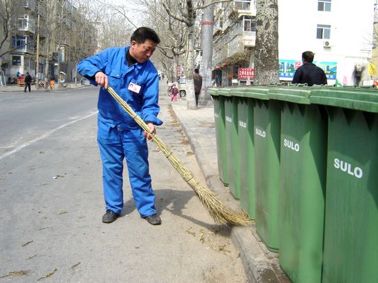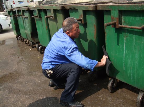 由于保潔工作性質(zhì)特殊,他經(jīng)常是費(fèi)了好大勁把箱體刷凈,把地面掃干凈,前腳還沒(méi)走遠(yuǎn),后腳又給丟了一地垃圾,只能重新回來(lái)清掃。趙慶武告訴筆者,有一次,他剛剛清掃完一組垃圾箱,還沒(méi)等他直起腰來(lái),"吧唧"一聲,從天而降一大包垃圾,連湯帶水地砸在他的后背上,衣服都被湯水濕透了。筆者問(wèn),有沒(méi)有感到委屈。趙慶武只給了筆者一句話"總有一天人們會(huì)理解的。"