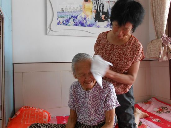 今年96歲的孫淑芝老人雖然眼睛失明、耳朵失聰,但養(yǎng)女滿叢芹細(xì)心地呵護(hù)著她。 老人住的房間是家中最好最大的正屋,被褥疊得方方正正,物件擺放的整整齊齊。滿從芹剛出生不到40天的孫子和兒媳也只能住偏房,丈夫住廂房。怕母親發(fā)生意外,她陪母親睡在同一個炕頭上15年。對于照顧老人,滿從芹覺得并不累,她說媽媽的身子板很好。但在鄉(xiāng)親們眼里,眼瞎了30年的老太太能有這么好的身子板,跟她這個好閨女的悉心照顧是分不開的。每天早晨,滿從芹都會在做好飯后叫媽媽起床,然后給她穿衣、梳洗,喂她吃飯,半上午加餐一頓水果,定期給媽媽洗澡、修剪指甲。在滿從芹的記憶里,最累的時候是媽媽眼睛剛失明的時候,那時父親癱瘓在床長達(dá)六年時間,也需要人照顧,她天天"頂著這個喂那個",那滋味跟"下油鍋"一樣。孫淑芝的身體一直很好,但也發(fā)生過"險情"。8年前的一個晚上,老人突發(fā)心絞痛,滿從芹摸黑跑去給老人買速效救心丸,給老人按摩,直到第二天早晨,老人終于緩了過來,滿從芹喜極而泣。