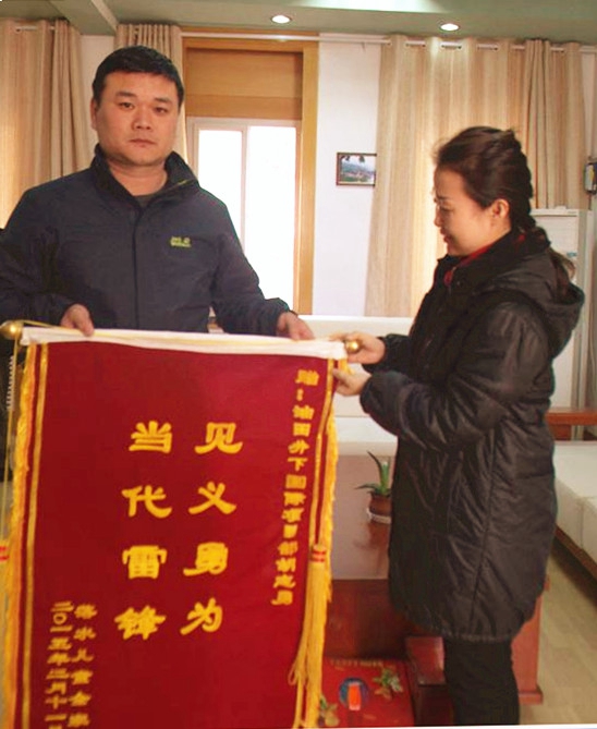 2月12日,被救兒童的父母來(lái)到胡志勇所在單位,送上了寫(xiě)有“見(jiàn)義勇為、當(dāng)代雷鋒”的錦旗!敖K于見(jiàn)到您了,胡師傅。沒(méi)有您,我們就失去兒子了,衷心地謝謝您!薄皼](méi)什么,我不過(guò)是做了一個(gè)公民應(yīng)該做的事。”胡志勇憨厚地說(shuō)。