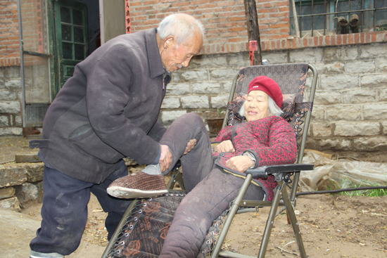 天有不測(cè)風(fēng)云。2005年2月,妻子突患腦血栓,半身不遂,住東阿鎮(zhèn)醫(yī)院半個(gè)多月,不能下床;氐郊依,在床上身子歪,陳文義就用被子頂著,喂藥喂飯,不熱也不涼,熱時(shí)吹吹,涼時(shí)熱熱。漲肚子時(shí),就用暖水袋給暖上。陳文義說(shuō),妻子年齡漸漸大了,經(jīng)受不了大的振動(dòng),為保證她的康復(fù),現(xiàn)在每天拽腿300次,再進(jìn)行脖子、腿局部按摩。妻子愛(ài)聽(tīng)《打金枝》、《斬秦英》等豫劇,為給妻子解悶,2年前,他買來(lái)了數(shù)碼播放器,讓她聽(tīng)個(gè)夠。他還時(shí)常為她開(kāi)玩笑、講笑話,讓她整天生活在快樂(lè)中。在陳文義的精心照料下,現(xiàn)在老伴能下床了,在他的攙扶下開(kāi)始行走……