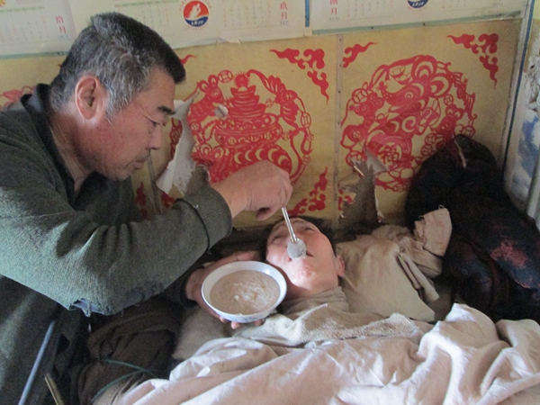 妻子癱瘓在床的10年間,老郭數以萬次的清洗尿布,雙手被屎尿侵蝕的厲害,患上了嚴重的過敏癥,手上的皮一層一層的脫落下來,露出了嫩肉,鉆心的疼,他舍不得花錢看病,戴上橡膠手套堅持為妻子清洗。怕妻子生褥瘡,他就給妻子勤換尿布、曬被褥,經常給妻子翻身、擦澡、按摩。兒子外出打工,家里的農活全都壓到了老郭身上,到地里干活,或是外出辦事,老郭最長呆不過兩個小時,就急急忙忙趕回去照看妻子。晚上老郭從沒睡過一個囫圇覺,天天衣不解帶,每隔兩三個小時就要看看妻子拉尿了沒有,給妻子翻翻身,捶捶腰腿。每天都滿面笑容的面對妻子,不惱不怒,心甘情愿,無怨無悔。