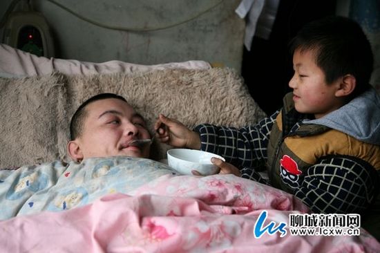 為湊夠爸爸每個月幾百元的醫(yī)藥費,媽媽選擇外出打工,照顧爸爸的責(zé)任就落在了小占順的肩上。給爸爸洗臉、擦背、喂飯、按摩、照顧他大小便、打掃家里的衛(wèi)生、照看年幼的弟弟…這些成了小占順每天的必修課。為了不耽誤學(xué)習(xí),每天小占順都是早早起來做家務(wù),照顧爸爸和弟弟。聽媽媽說按摩有利于爸爸康復(fù),只要有時間,占順都會給爸爸做按摩,很多時候手指累的酸痛,吃飯時連筷子都握不住。占順穿的是好心人送的舊衣服,吃的是自家地里種的菜,有時親戚送點肉,一家人吃上好幾天。占順知道自己的家庭條件,從來沒有亂花過一分錢。說到爸爸的病情,占順很樂觀。"我最大的愿望就是爸爸有一天能站起來。"他說,爸爸很堅強(qiáng),一直在與病魔作斗爭,爸爸的病情也在逐漸好轉(zhuǎn),原來只能用針筒往胃里打飯,現(xiàn)在可以用勺子喂爸爸吃飯了。占順每天放學(xué)后一有時間就給爸爸講學(xué)校發(fā)生的新鮮事,他相信爸爸總有一天會親口回答他。