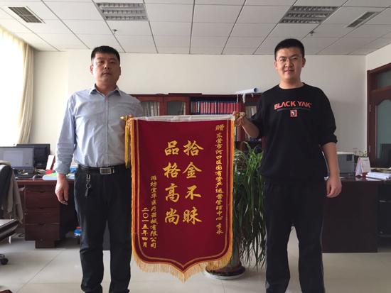 4月17日在河口區(qū)政務(wù)服務(wù)中心二樓大廳招投標報名窗口,一位前來報名的投標供應(yīng)商不小心將錢包遺忘在了報名窗口,李永忙完工作之后在地面上發(fā)現(xiàn)了錢包,打開一看,里面裝有3000元現(xiàn)金、身份證和銀行卡、醫(yī)?ǖ葞资畯埧,此時,李永意識到失主肯定心急如焚,他馬上打電話聯(lián)系失主,前后打了十多次,奈何一直不通,事后知道失主在高鐵上,信號不通;李永隨即將錢包鎖在廚子里妥善保管。次日早上,電話終于通了,原來失主是濰坊宜華醫(yī)療器械有限公司陳經(jīng)理,他已經(jīng)回到了濰坊,失主聽到李永的敘述之后非常欣慰和感謝,失主說:“他自己昨天找了一天以為肯定是丟了,心想丟點錢是小事,補辦那些證件不僅需要一個月還耽誤其他地市的投標報名,要是這些證件找不到損失就大了,壓根想不到有這么好的人能將他的錢包還給他,太感謝河口區(qū)國有資產(chǎn)運營管理中心的小李同志了!”他們商議兩天之后領(lǐng)取失物,兩天后失主如約而至,李永核實失主相關(guān)的證件,確認無誤后將錢包完好的交給了失主,失主當場拿出一部分錢交給李永以示感謝,李永婉言謝絕了,陳經(jīng)理非常感動,為了表示衷心的感謝,來到單位送上一面“品格高尚 拾金不昧”的錦旗。