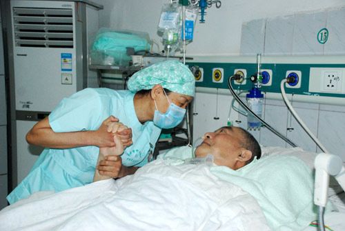 依靠多年的經(jīng)驗(yàn),李秀梅懂得在病人脆弱的時(shí)候,適當(dāng)?shù)陌参坑袝r(shí)會(huì)起到很大的作用,在監(jiān)護(hù)室內(nèi),只要有患者意識(shí)清醒,她便過(guò)去與患者交流,為患者加油鼓勁兒,記者看到,李秀梅緊握患者的雙手,在患者耳邊輕輕地說(shuō)了幾句,患者雖已說(shuō)不出話(huà),但伸出了大拇指來(lái)回應(yīng)她,此時(shí)此刻,在一旁的人們無(wú)不為之動(dòng)容。李秀梅說(shuō)"重癥科里有很多老人,有時(shí)候他們就像個(gè)孩子一樣,也會(huì)耍耍小脾氣,這時(shí)候需要我們護(hù)士給他們更多的安慰和鼓勵(lì),用心去呵護(hù)他們。"
