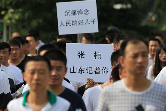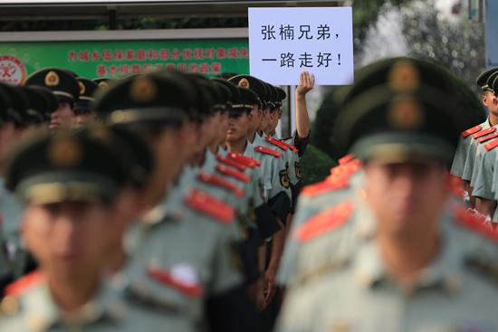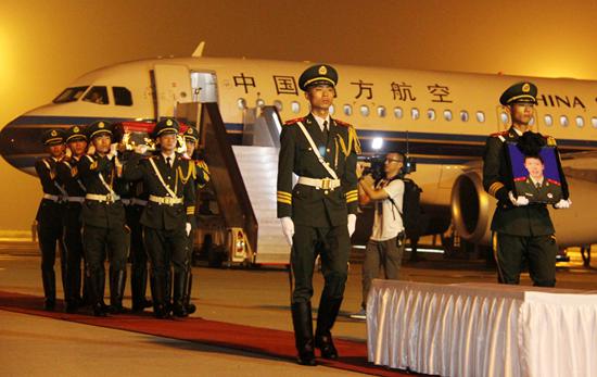 8月1日,在儀仗隊的護送下,覆蓋著中華人民共和國國旗的張楠烈士靈柩被緩緩抬下飛機,送上靈車。