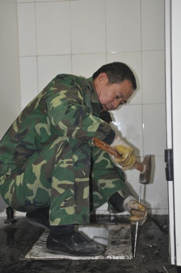 在公廁維修工作中,閆國良經(jīng)常需要用錘子敲打鐵釬,拆除蹲便器或瓷磚。稍不注意,便將錘子敲打在手上。如今,他的雙手已經(jīng)是傷痕累累。同事們經(jīng)常看見他手上掛彩—纏著紗布!拜p傷不下火線,公廁維修一天也不能耽誤!”閆國良時(shí)時(shí)刻刻嚴(yán)格要求自己,一年365天,閆國良很少休息,他沒休過公休假,節(jié)假日也沒歇過。對(duì)市區(qū)內(nèi)38家公廁的水管、線路、閥門等,他都熟悉的如同自己的十個(gè)手指頭。因?yàn)楣?jié)假日如廁人員增多,公廁使用率高,隨之損壞率也高。越是節(jié)假日他越是忙碌。有多少次早已是萬家燈火,團(tuán)圓的鞭炮響成一片,而他則汗流浹背的埋頭修理廁所。公廁維修工作不但苦和累,而且很臟。有多少次在維修時(shí),糞便濺灑到他的身上,有多少次妻子勸說他換一份工作。也有人在背后議論他們管理組所負(fù)責(zé)的工作,說他們干這些又臟又累的活,是“傻漢”。聽到這話后,閆國良只是笑笑,他說,“我不管別人怎么說,只知道要干好我的本職工作。”就是這樣樸實(shí)的話語,我們看到了一個(gè)舍小家為大家的環(huán)衛(wèi)工人的高尚品質(zhì)。在眾多的環(huán)衛(wèi)工人中,閆國良只是其中普通的一員,他努力工作,默默奉獻(xiàn)不計(jì)個(gè)人得失,在臟累面前,不懂后退,只有前進(jìn),這就是我們當(dāng)代的環(huán)衛(wèi)工人。