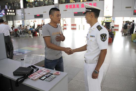 10日上午10時許,媒體接到報料后來到青島長途汽車站候車大廳,見到了幾位身穿軍裝的戰(zhàn)士,不一會兒,一位男子扶著一位老太走進候車大廳,在將老人扶到旁邊座椅上坐好后,該男子決步走了過來。“你好,請問你是王先生?能說一下你的身份證號碼嗎?"其中一位海軍戰(zhàn)士手持一本駕駛證問道,在得到準確答案后,海軍戰(zhàn)士將駕駛證放回挎包,交到了這位男子手中,“快檢查一下里面物品有沒有缺失。" 接過挎包后,男子急忙放到一旁的小桌上檢查,里面有四摞百元鈔票和一沓美元,還有駕駛證、身份證等證件。經(jīng)確認無誤后,男子一把握住了這位海軍戰(zhàn)士的手,“一分錢也沒少,包里所有東西都是完好的,真是太感謝你們了。"
