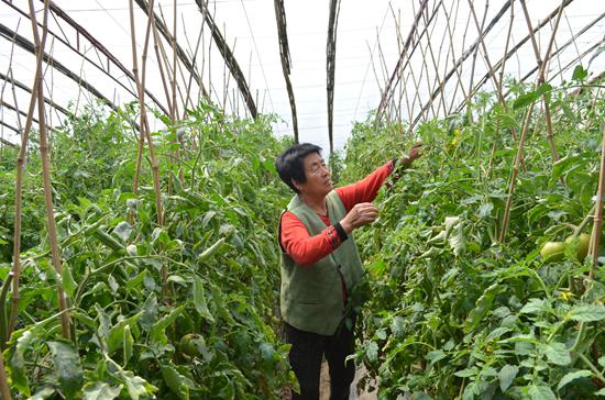 王業(yè)秀在承包的西紅柿大棚里勞作