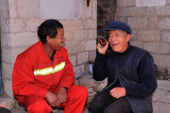 2015年8月24日,剛剛進(jìn)村,曹永海便直奔彭先收老人家中,將一部帶存儲(chǔ)功能的收音機(jī)遞給了彭先收,聽著從喇叭里面?zhèn)鞒龅淖终粓A的京劇片段,彭先收老人開心的笑了,曹永海兌現(xiàn)了上一次的許諾,也欣慰的笑了……